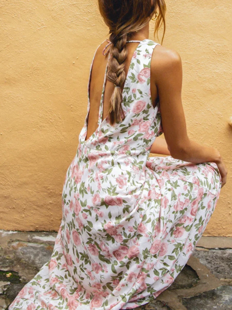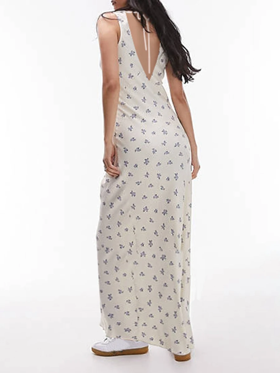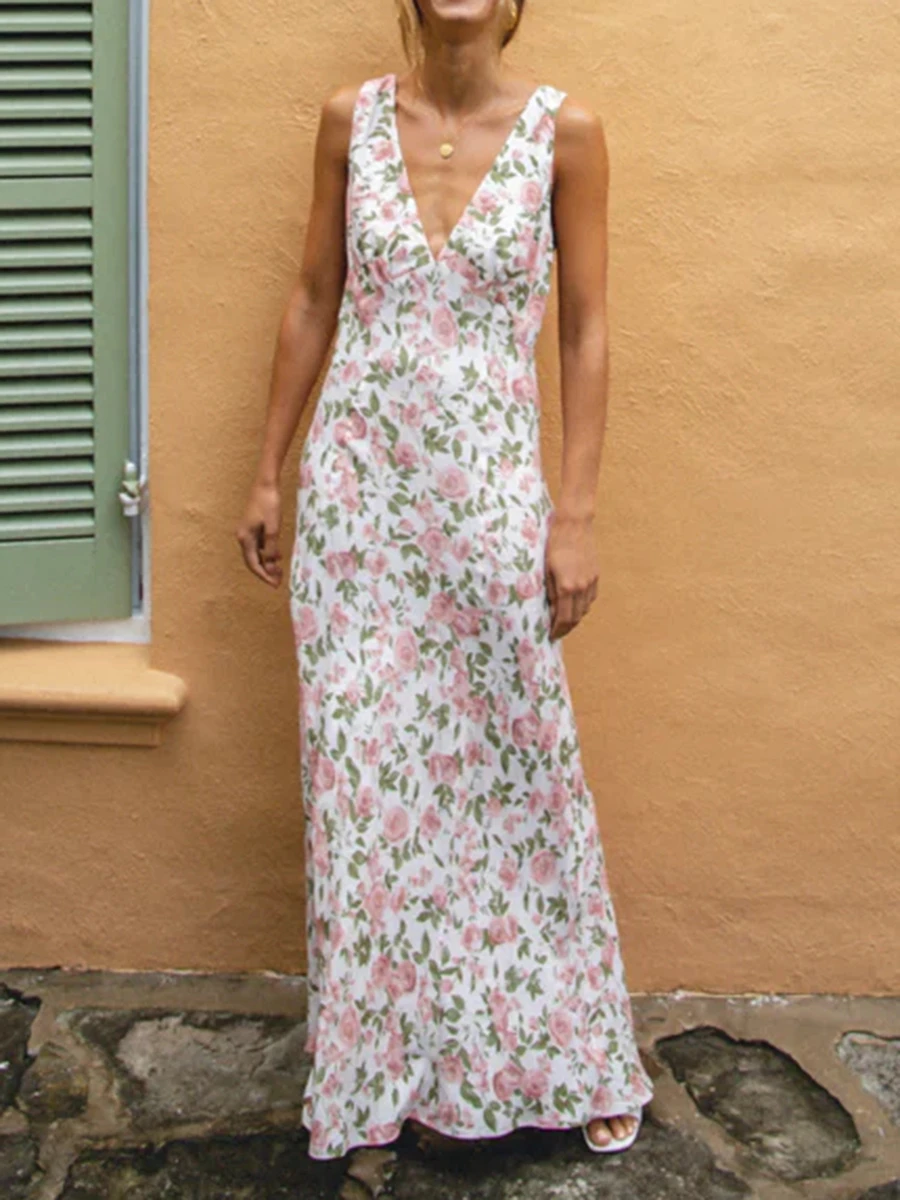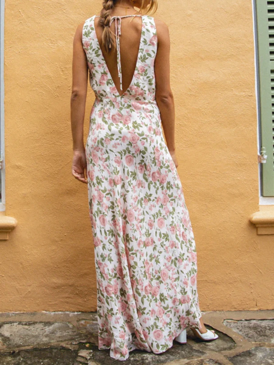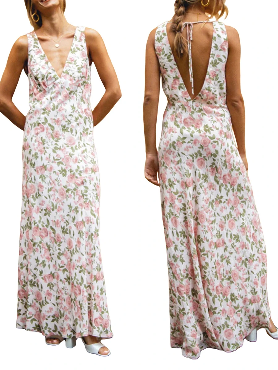 Women's Long Slim Tank Dress Summer Sleeveless Open Back Deep V Neck Floral Print Dresses