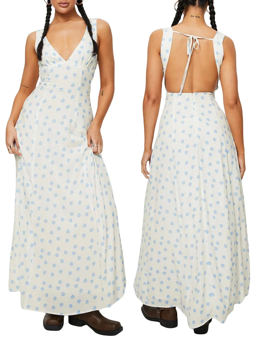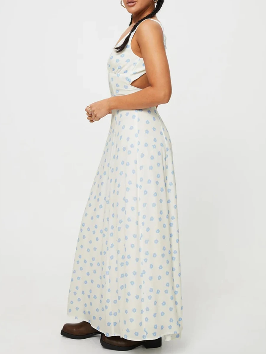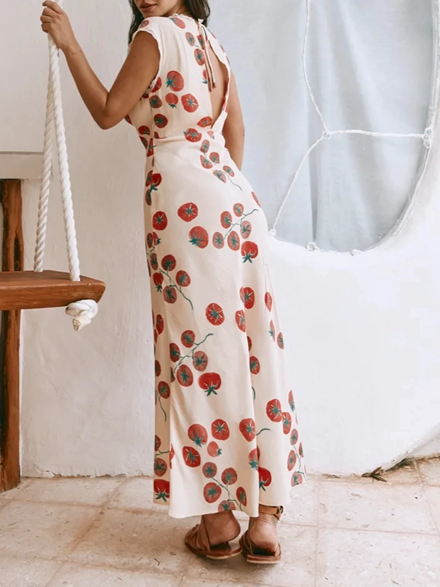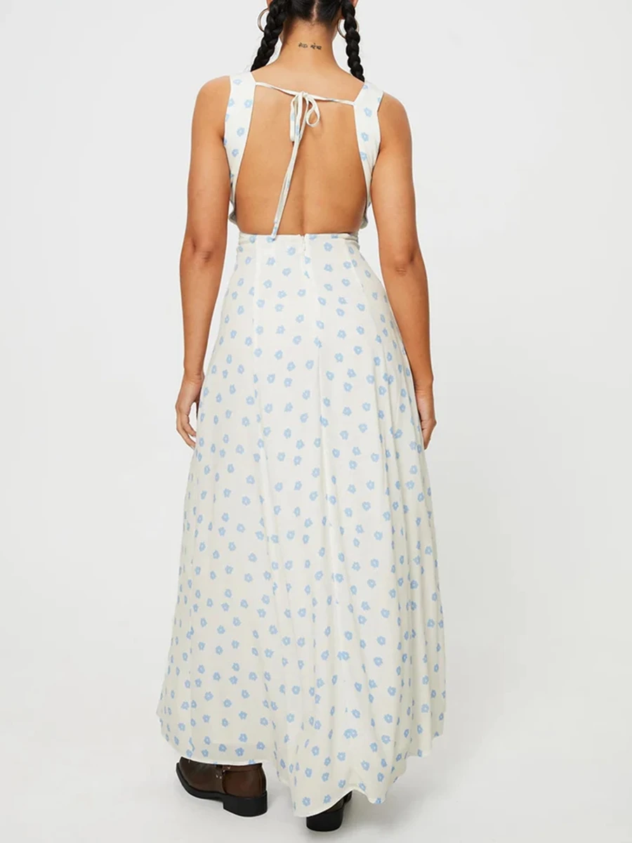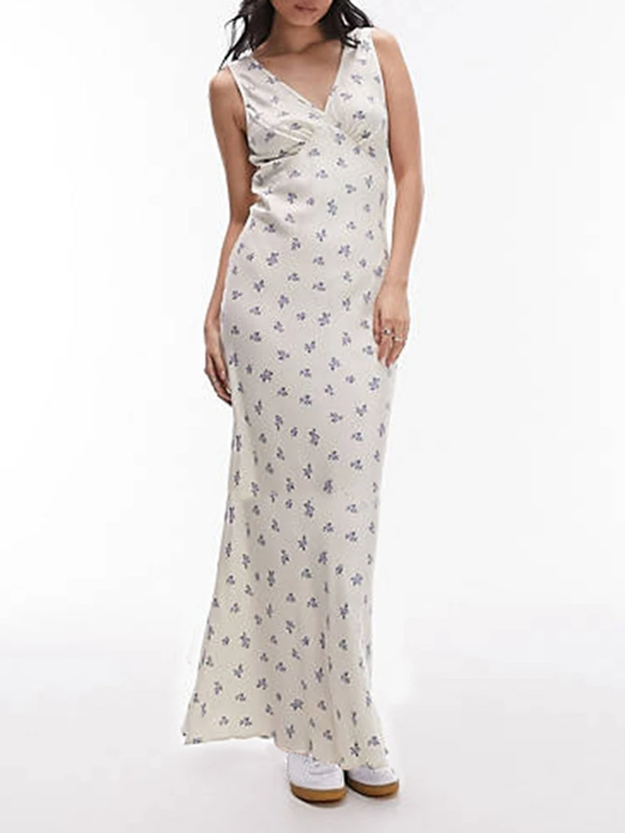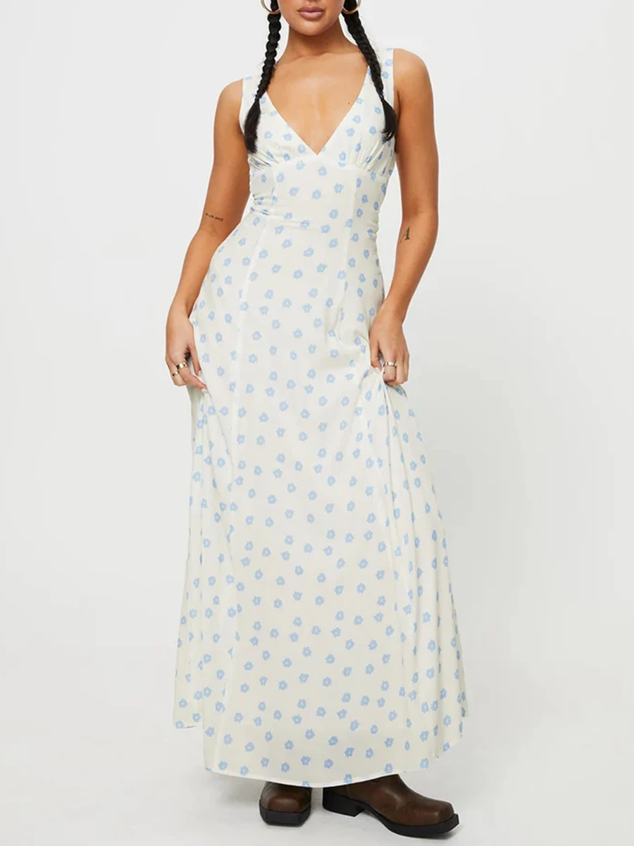 Women's Long Slim Tank Dress Summer Sleeveless Open Back Deep V Neck Floral Print Dresses